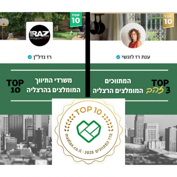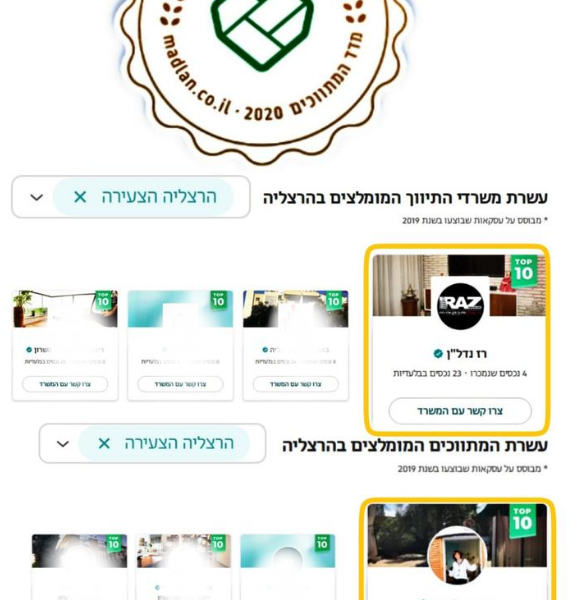 עפ”י מדד המתווכים של אתר “מדל”ן” לשנת 2019/20 ולשנת 2020/21 : משפחת רז נדל”ן נבחרו בטופ 10 משרדים מומלצים בהרצליה, וענת – בטופ 3 *זהב* המתווכים המומלצים בהרצליה !